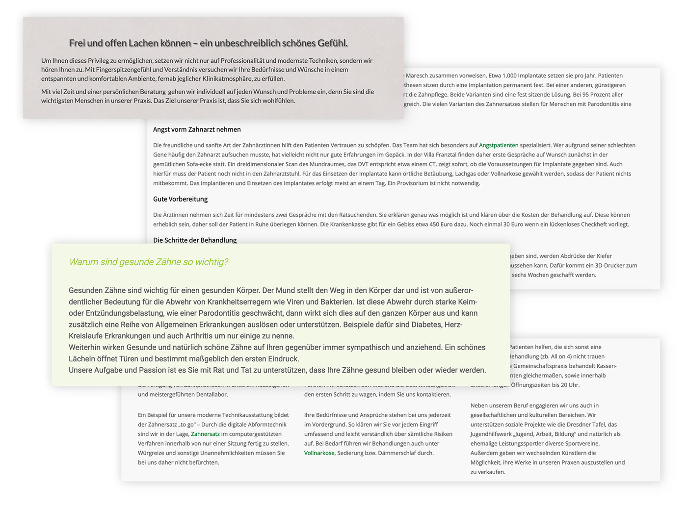 Kurze, knackige Texte und längere Fachartikel sollten je nach Bedarf erstellt werden. Moderne Contentgestaltung ersetzt klassische Textwüsten und berücksichtigt das Scanverhalten der Nutzer.